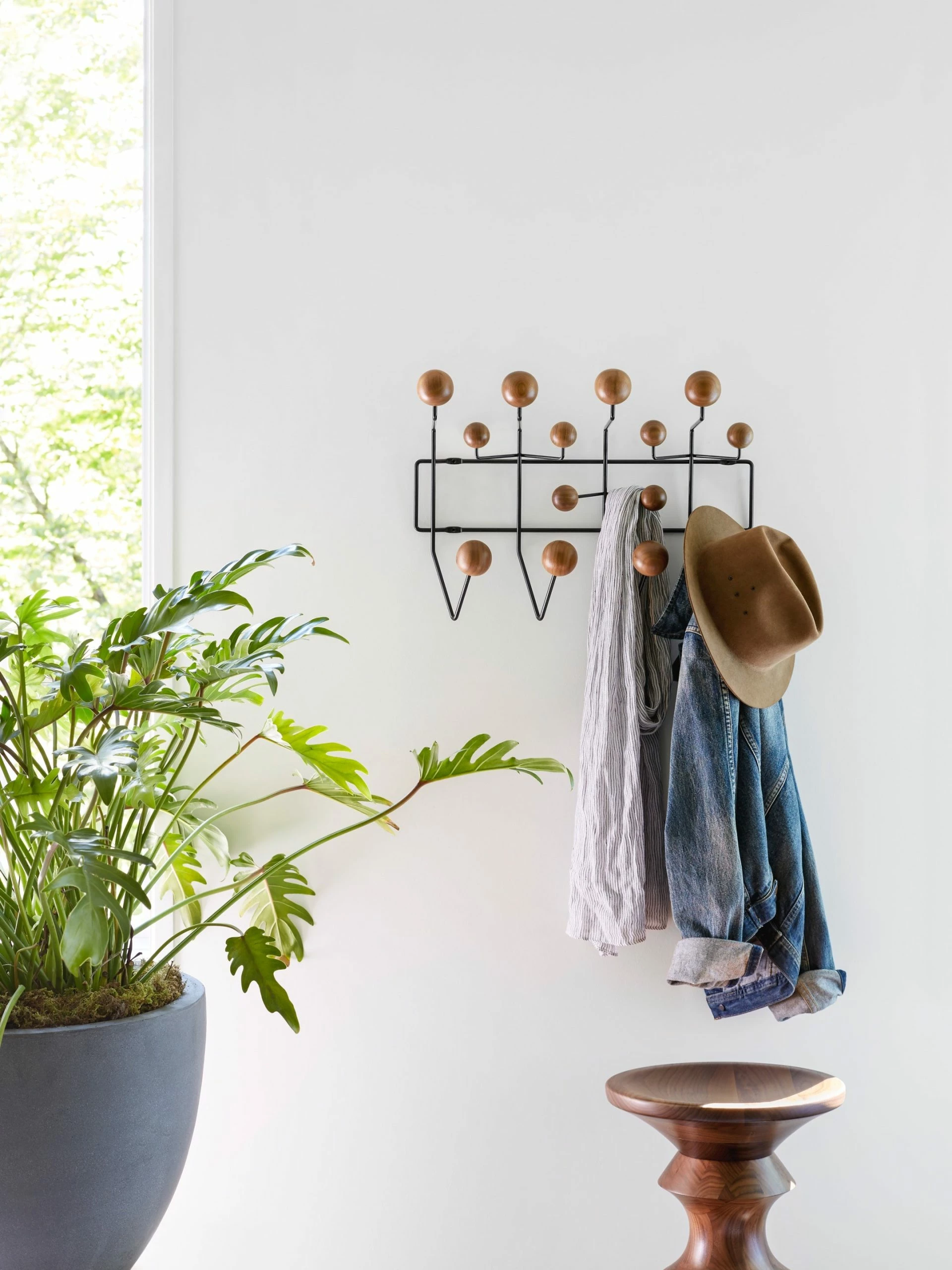 The Eames Walnut Stool (1960) was originally designed for the lobby and executive suites of the Time-Life Building at Rockefeller Center in New York City. Ray took the lead on design, drawing on her sculpture training. Working with blocks of solid walnut, the Eameses used a lathe to sculpt pleasing profiles, similarly to how one would be used to make turned legs for chairs and tables. After experimenting with several ideas, the duo chose three shapes for the Time-Life lobby to accompany the Eames Executive Chair and large murals by Josef Albers and Fritz Glarner. Crafting each for use as a table or seat – finding just the right curve for the top was crucial to its success – the Eameses were so fond of the design that they used it throughout their Pacific Palisades home. This is the authentic Eames Walnut Stool by Herman Miller. Made in U.S.A.