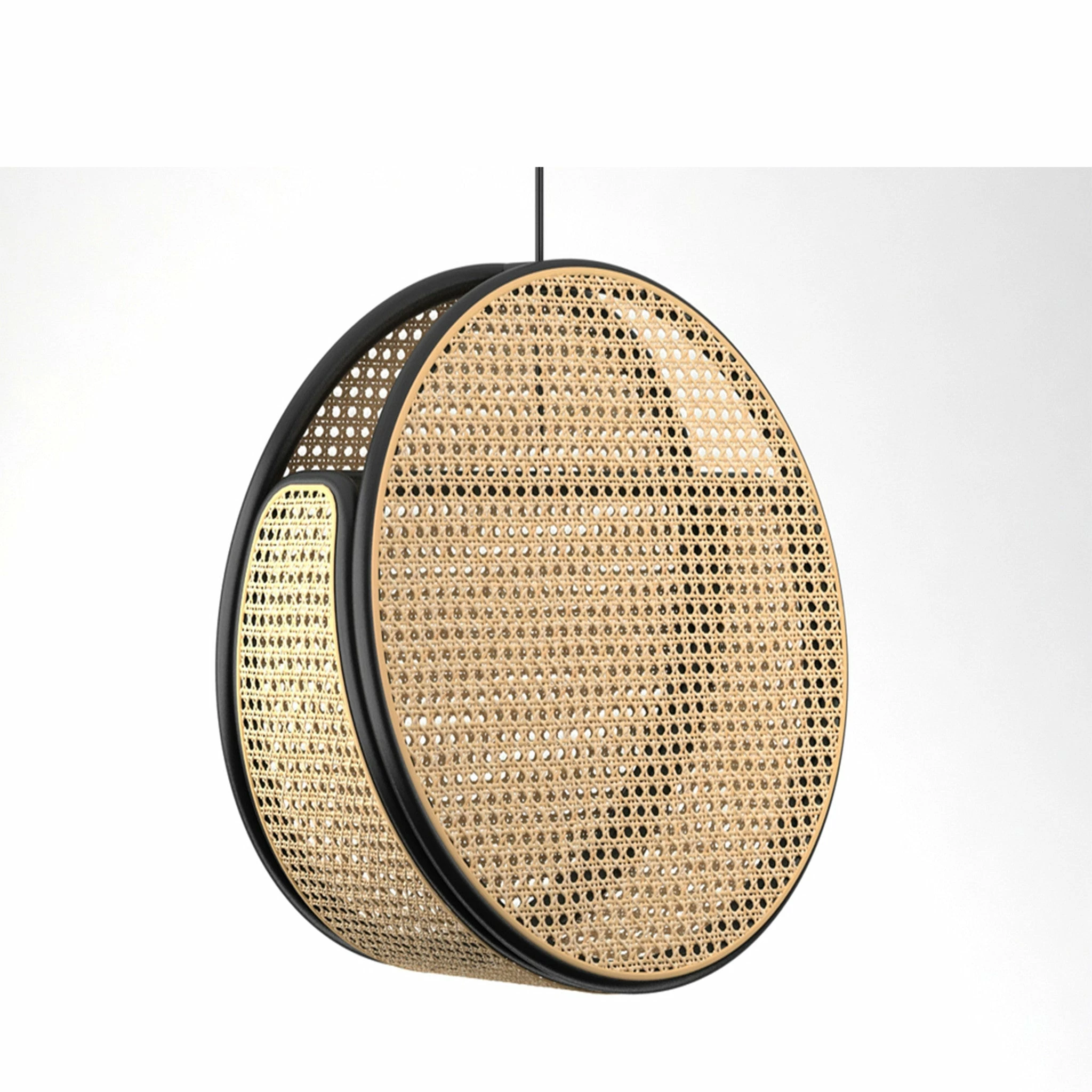 The natural rattan and woven cane webbing on the Jacaranda Lamp, designed by Dennis Abalos is inspired by the shape of a Jacaranda seed pod, casting shadows when lit up. Available with either a black or natural frame.