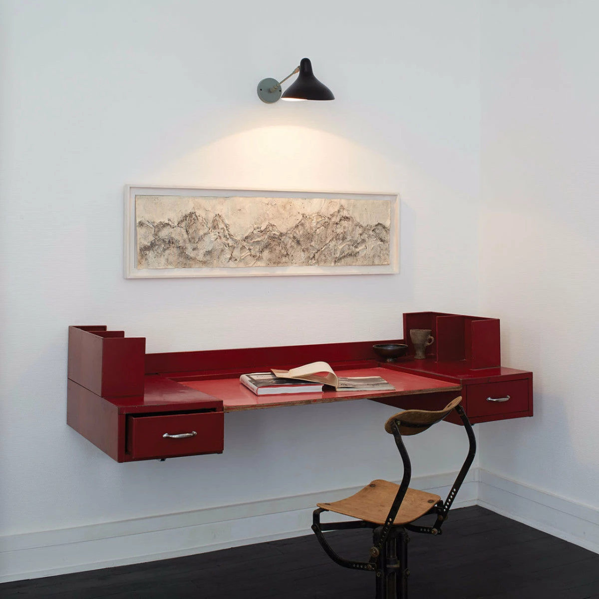 In 1951, Bernard Schottlander designed and created the Mantis series of lamps. Movement is intrinsic to all of Schottlander’s work: an artist, an engineer and in no small measure a handyman, he devised a clever system of counterweights combined with a series of strong, and flexible metal bars.The shade also is unique of its kind. Like an acrobat suspended in mid-air, it is made from aluminium using spinning and chasing techniques that are a part of the metalworker’s inventory of skills, but to which he has brought his sculptor’s eye to create a helical movement in which the symmetrical and the asymmetrical are in opposition.